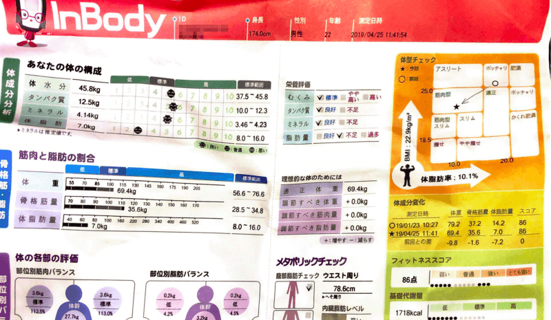 InBodyの計算上ではありますが、10kgの減量で2.7kgの筋肉量を失いました。